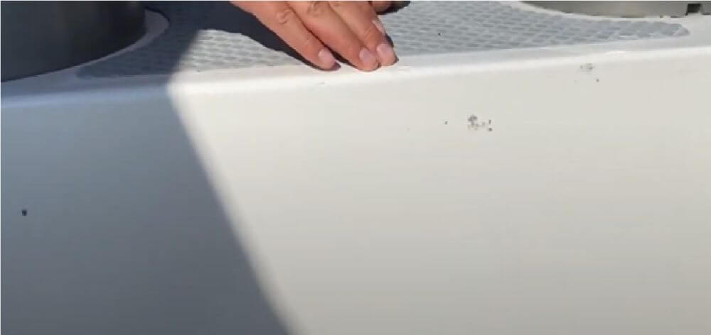 Розглянемо типове пошкодження покриття – тут працював фал, і протер гелькоут майже наскрізь. Також у нас є поверхневі сколи та один наскрізний. Вони обов’язково виникають, якщо яхта активно експлуатується.