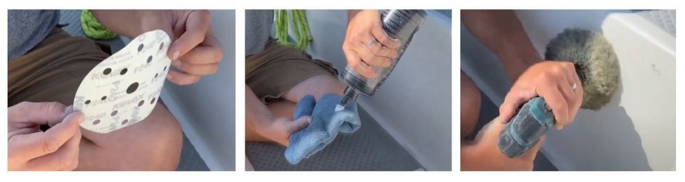 Отже, скол – це зовсім не страшно, якщо не пошкоджена композитна основа під гелькоутом. Ми бачимо, як від місця удару розійшлися тріщини, удар був не дуже сильний, тому все, що нам потрібно зробити – це зашпаклювати цю вм’ятину. Отже, беремо шуруповерт із абразивною насадкою і знімаємо верхній шар гелькоуту, щоб підготувати поверхню. Працюємо обережно, не прикладаючи зайвих зусиль. Тепер беремо наждачку та легенько шліфуємо. Щоб новий шар гелькоуту краще прилипав.