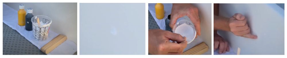 Беремо чистий гелькоут з пляшки (його можна купити у будь-якому яхтовому магазині в марині), не додаючи жодних загусників. Також беремо чорний пігмент і жовтий пігмент – це база. Беремо наш звичайний білий рідкий гелькоут, той, що ми наносили разом зі шпаклівкою, і наносимо крапельку гелькоуту. Так ми наочно бачимо, що ми отримали б, якби покрили звичайним гелькоутом нашу ділянку. Ви побачите різницю у кольорі.