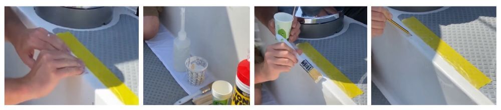 Нам потрібно, щоб гелькоут акуратно ліг туди, куди потрібно. Спочатку ми заклеїмо палубне покриття, тому що ми не хочемо його зіпсувати. Особливо коли за всім спостерігає господар човна. Стандартний малярський скотч – він просто захищає поверхню. Єдине, що стосується малярського скотчу – не допускайте, щоб він намок, а потім висох під сонцем. Після цього навряд чи ви легко його відклеєте, не застосувавши місного слівця.