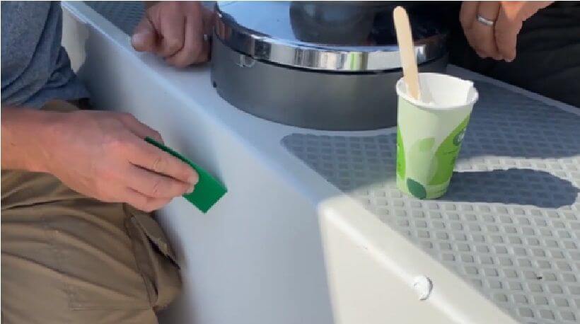 Коли суміш готова до роботи, беремо трошки шпаклівки і наносимо на пошкоджені ділянки. Далі беремо пластиковий шпатель (купити його можна практично скрізь, навіть на заправці) і просто розгладжуємо нашу шпаклівку. Вона дуже легко лягає. Спочатку пригладжуємо в один бік, потім у інший. І робимо так, доки всі нерівності не зникнуть. Чому також важливо не сильно тиснути на шпатель – гелькоут можна таким чином не нанести, а зняти. Після нанесення чекаємо близько 30 хв. Стаканчик зі шпаклівкою в жодному разі не залишаємо будь-де, а особливо під прямим сонячним промінням. Це екзотермічна суміш, що виділяє багато тепла. Ховаємо її кудись у безпечне місце, інакше вона вступить у реакцію і роз’їсть не лише склянку, а й частину палуби, де ви її залишили.